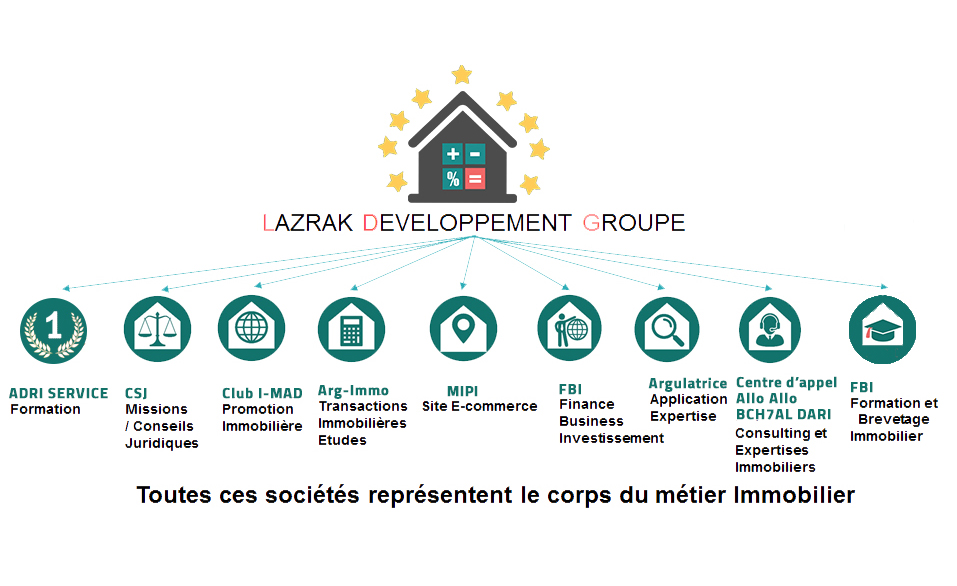 LAZRAK DEVELOPPEMENT est un groupe de sociétés géré par M. LAZRAK Aimad PDG et une équipe d’ingénieurs spécialisés dans le développement immobilier, industrie et formation. Les experts de LDG et de son réseau apportent des réponses adaptées à leurs clients pour la réalisation et l’exploitation de leurs projets.